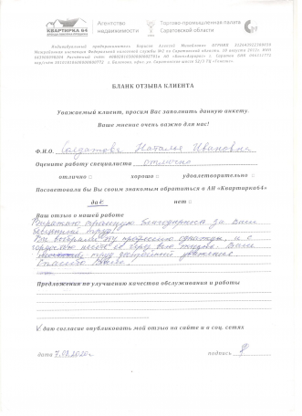 Выражаю огромную благодарность за ваш бесценный труд. Вы выбрали эту профессию однажды и с гордостью несёте её через всю жизнь. Ваш нелёгкий труд достойный уважения. Спасибо Вам. отзыв о работе сотрудника АН "Квартирка-64" Волкова Алексея. ...